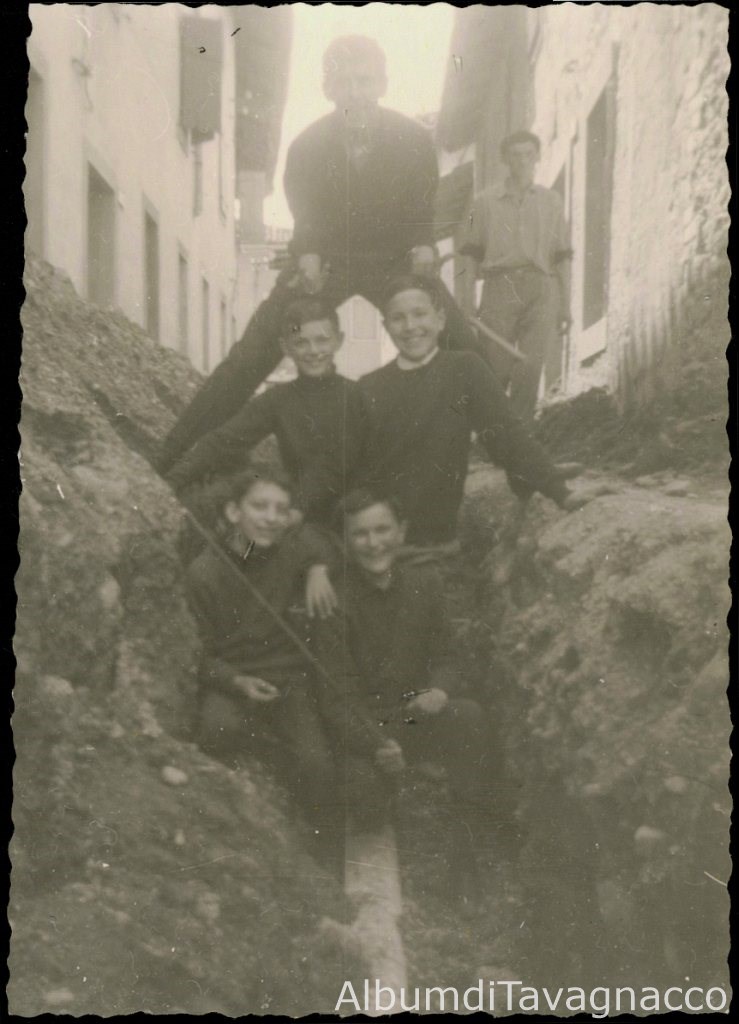 Gruppo di cinque ragazzi in posa scherzosa in Via Cincinnato, all'interno di uno scavo stradale realizzato per la messa in opera della fognatura.