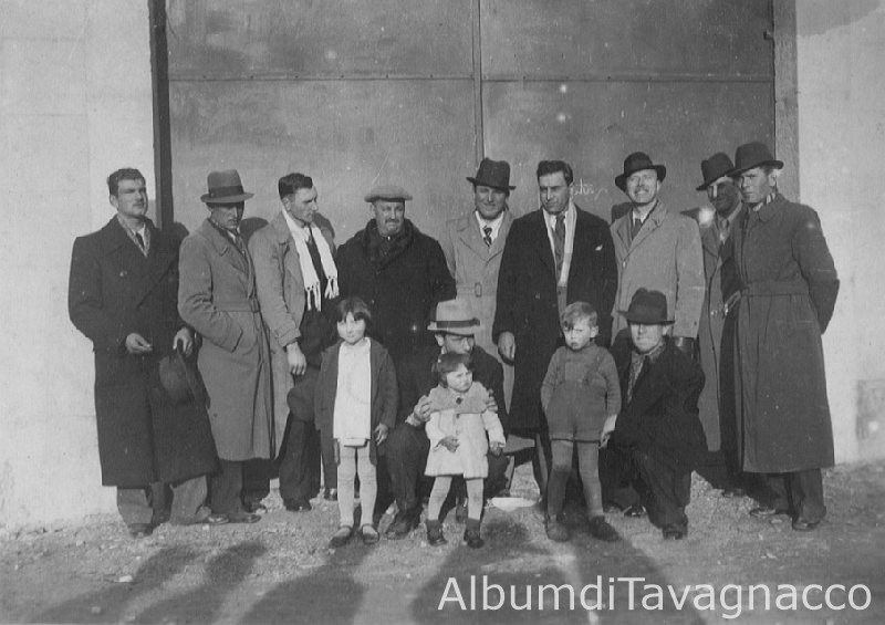 Gruppo di paesani in posa davanti al portone della vecchia officina Bertoli, in Via Cividina.