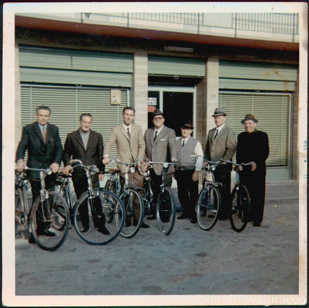 Gruppo di compagni di briscola (Berto, Freddo, Marco, Lino, Mario, Aligi, Ciro) in posa con le biciclette e davanti al bar di Via Dante, in una domenica di "austerity" con la circolazione delle vetture vietata per la "crisi di Suez".