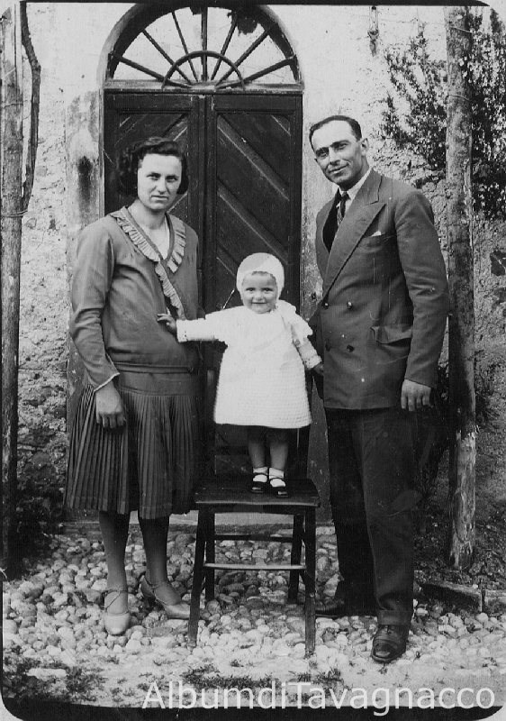 Coniugi in posa con il figlioletto al centro, in piedi su una sedia, davanti alla porta di una casa.