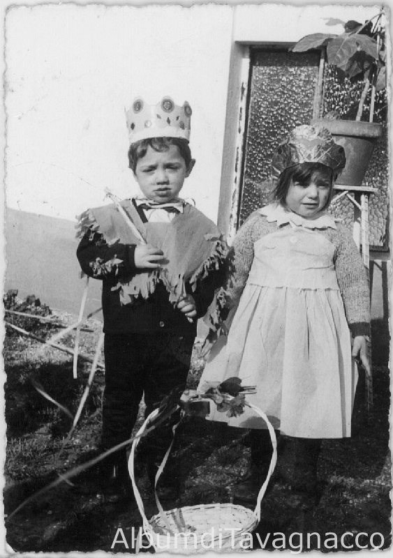 Coppia di bambini in maschera, in posa nel vecchio asilo, in occasione di una festa di carnevale.