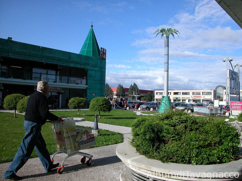 Centro commerciale: Corte Smeralda. - Giardino. - Negozi. - Alberi. - Palma finta. - Insegne. - Aiuola. - Piante. - Uomo. - Carrello. - Cartello. - Paletti