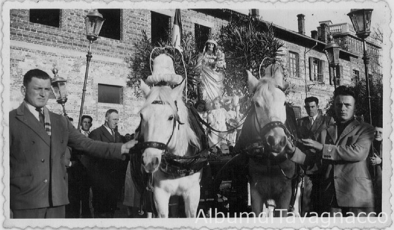La testa del corteo della processione, con un carro trainato da due cavalli bianchi che trasporta la statua della Madonna.-