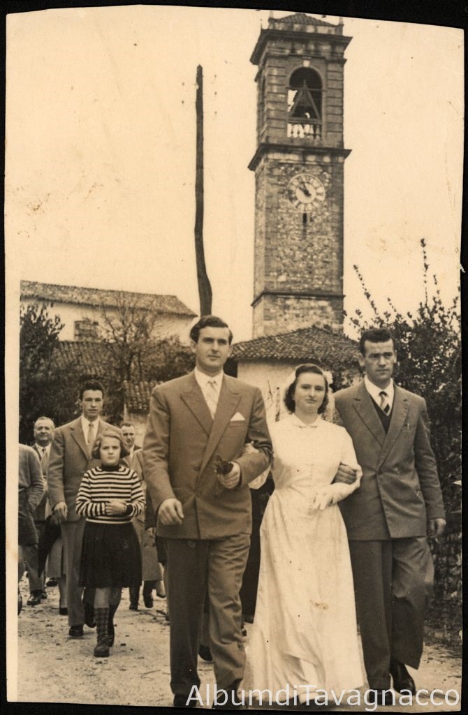Corteo nuziale nei pressi della chiesa di San Clemente. In primo piano gli sposi Ariedo Sacher e Genoveffa Feruglio.