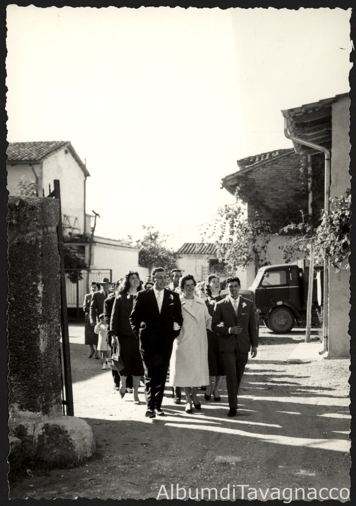 Corteo nuziale in Via Feletto, preceduto dagli sposi Iole Piuzzi e Dino Bon.