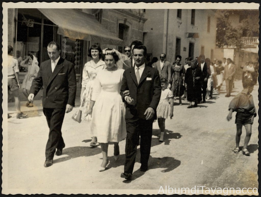 Gli sposi, Bruna Miani e Lidio Cornacchini, in primo piano nel corteo nuziale che percorre Via Centrale.
