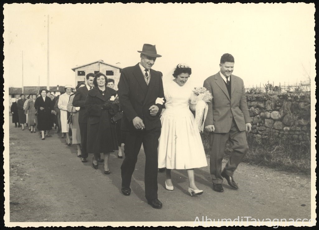 Corteo nuziale in Via Cesare Battisti (oggi Via Damiano Chiesa), preceduto dalla sposa Rosina Beltrame che è accompagnata a braccetto dal padre Giovino.