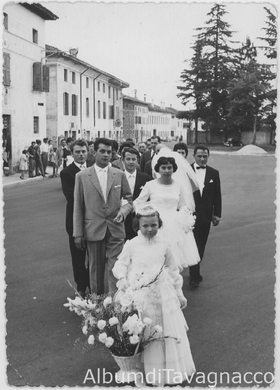 La bambina Gianna Righini, vestita da damigella, accompagna gli sposi e il corteo nuziale all'ingresso della chiesa di S.Antonio Abate.-