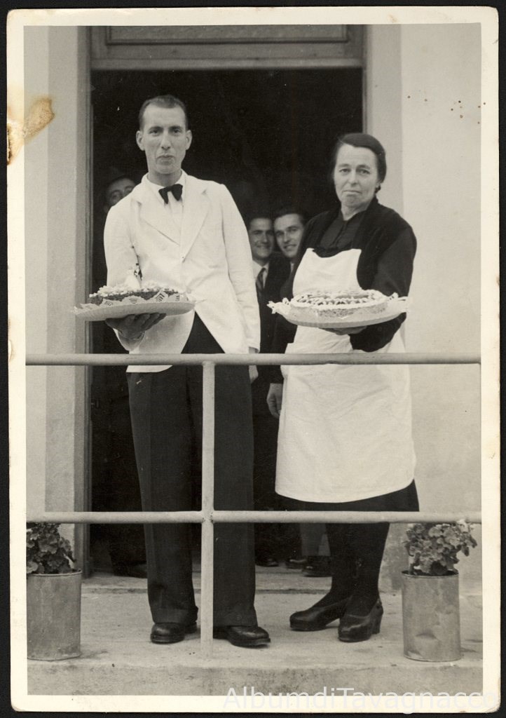 Coppia di cuochi, ognuno con una torta, in posa su una terrazza, in occasione del matrimonio Bernardis.