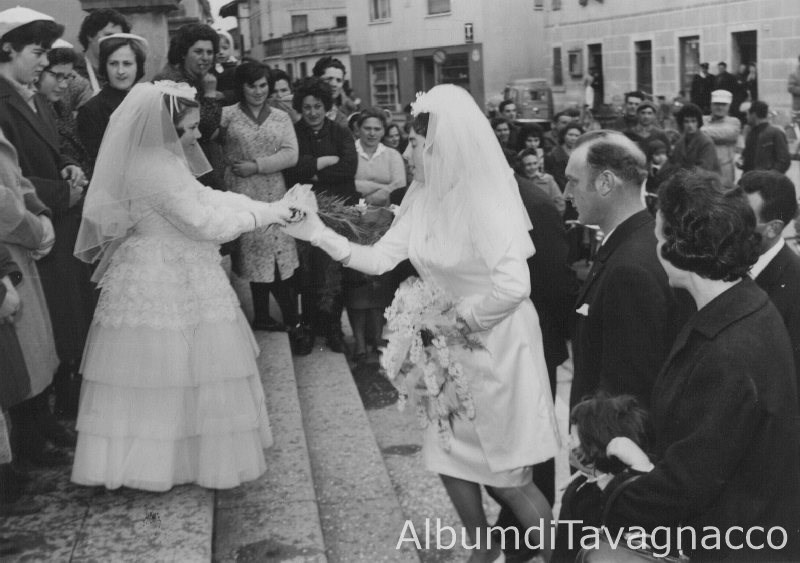 La bambina Gianna Righini, vestita da damigella, accoglie gli sposi sul sagrato della chiesa di S.Antonio Abate, in mezzo ad un folto gruppo di persone.