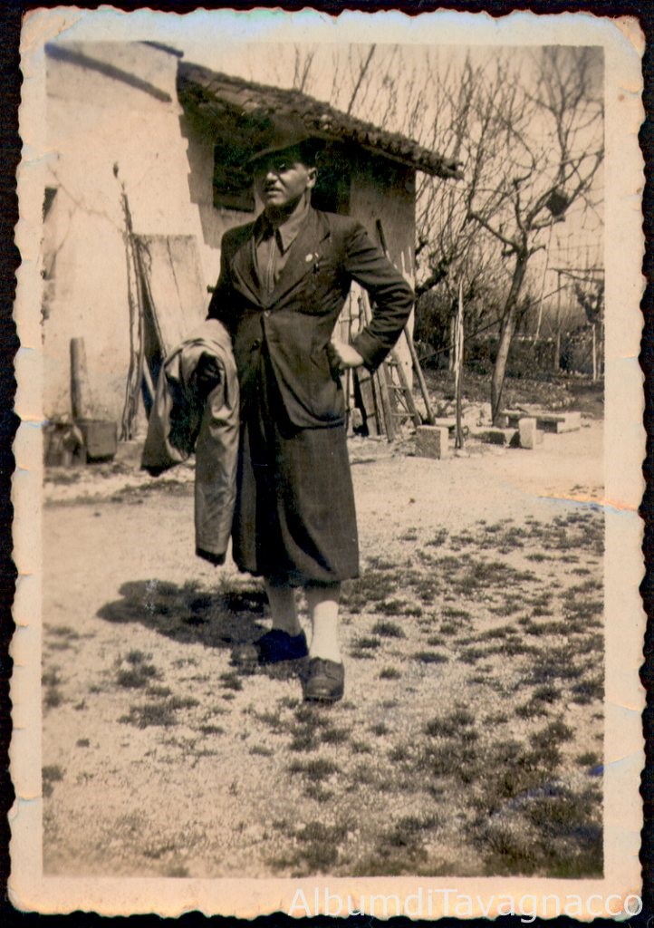 Ritratto di Delfino Tioni, vestito in modo particolare (cappello, giacca e calzoni alla zuava), in posa nel cortile di casa, in Via Molin Nuovo.