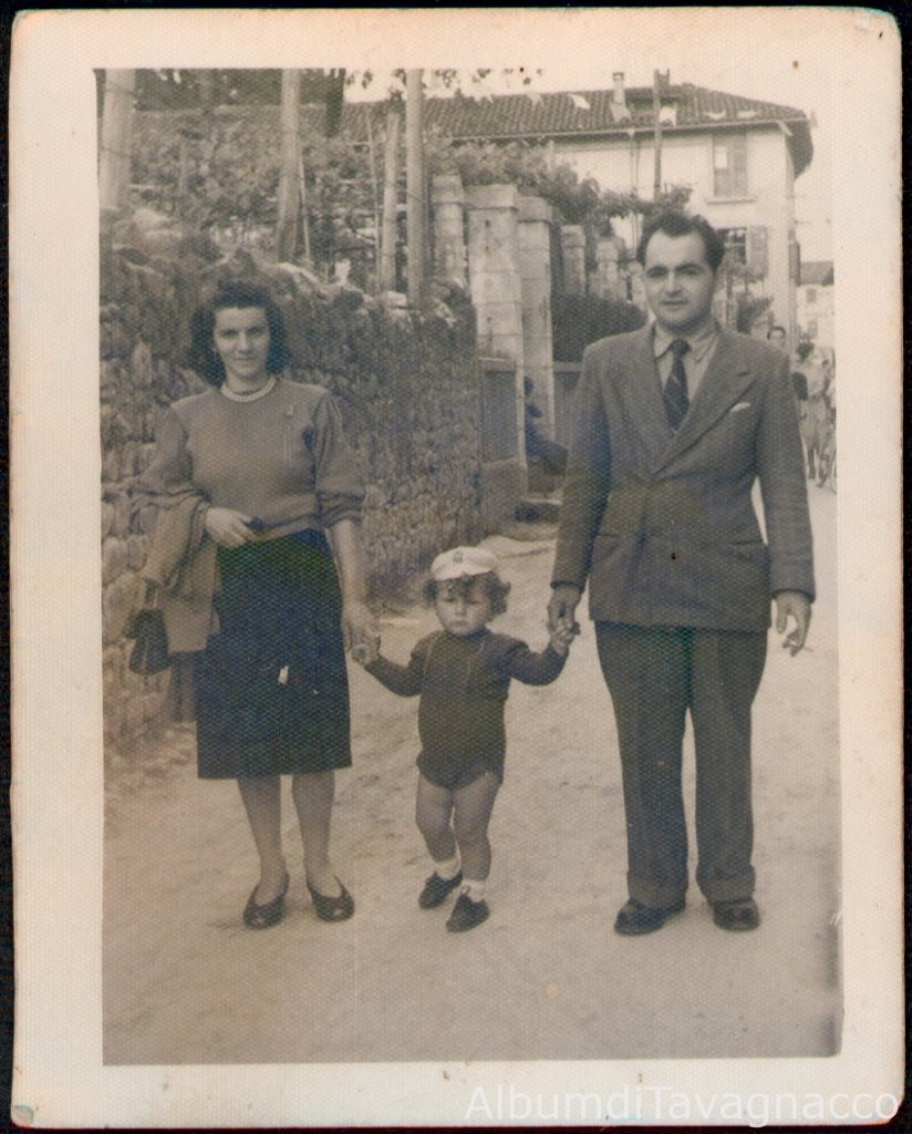 Ritratto di Delfino Tioni in posa insieme alla moglie e al figlio Fiorello, in Via Molin Nuovo.