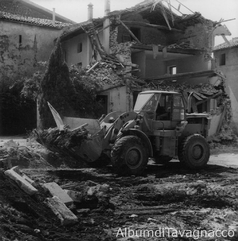 Demolizione di un vecchio edificio di Via Udine dove, in seguito, sorgerà il nuovo negozio "Arteni Confezioni" (primavera 1972).