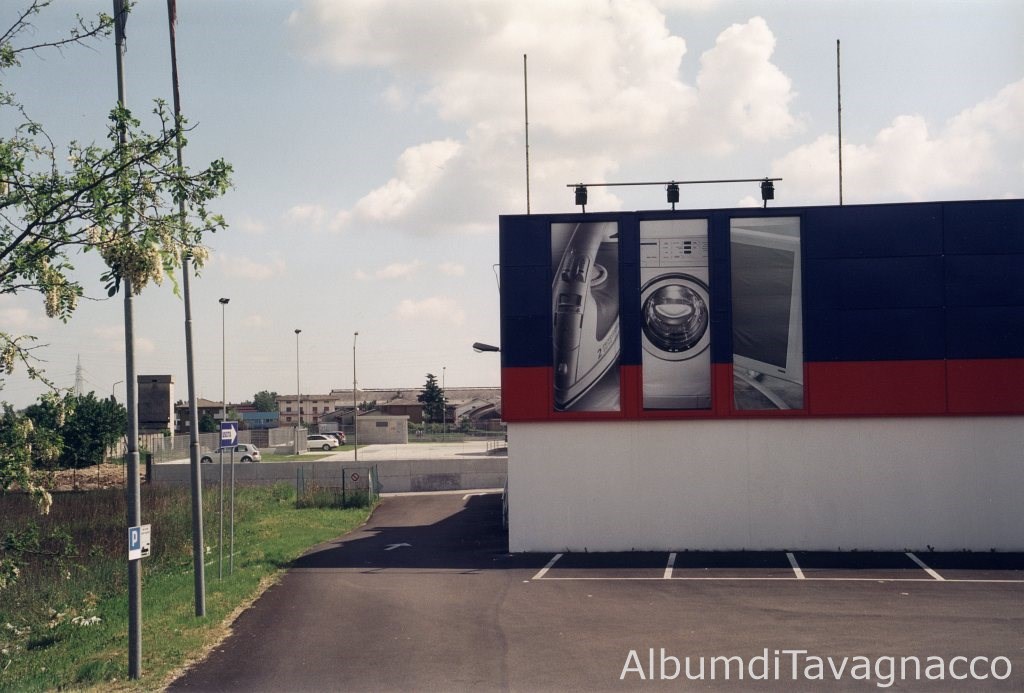 Negozio: ‘Trony’. - Cartelli stradali. - Parcheggio. - Capannone. - Pali della luce. - Automobili. - Case. - Alberi