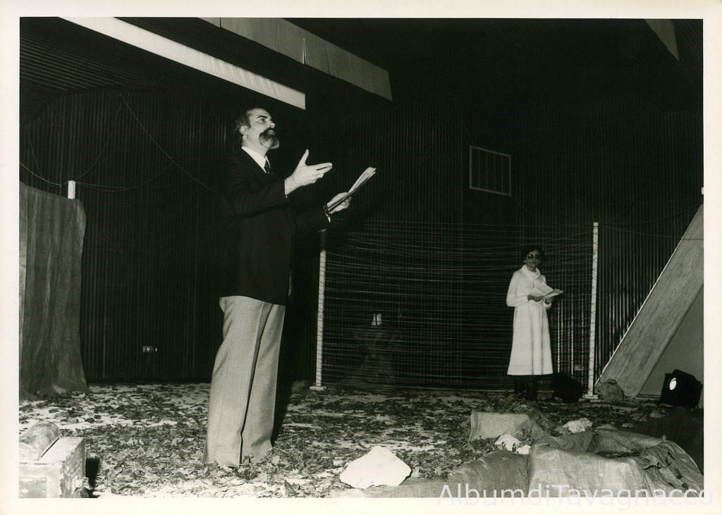 Un attore e un’attrice, sul palco dell’auditorium, leggono e interpretano un testo durante la rappresentazione teatrale dell’Opera tratta dalla “Domenica dei silenzi” del poeta Luciano Morandini.