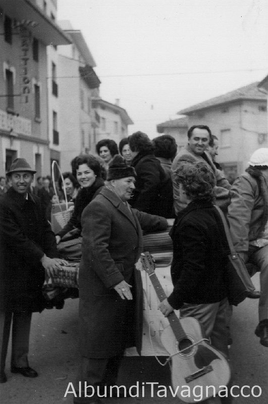 Un gruppo di persone sopra a un carro, in Piazza Libertà, durante una domenica di "Austerity" (periodo in cui c'era il divieto di circolazione per gli autoveicoli).
