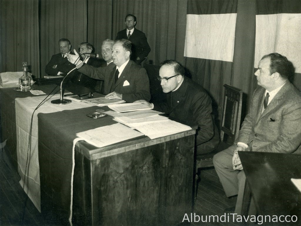 Don Aldo Moretti, medaglia d’oro al valor militare e promotore della Resistenza in Friuli, al tavolo delle autorità, durante un convegno dell’Associazione Nazionale Mutilati e Invalidi di Guerra.