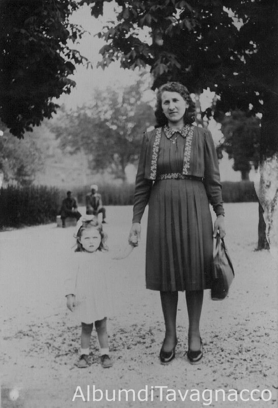 Donna con bambina, in posa nel parco.