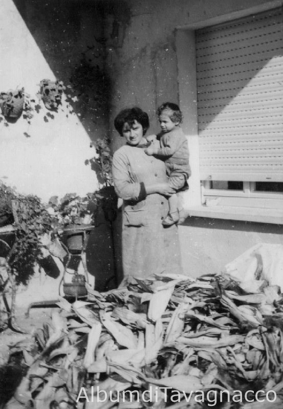 Ritratto di una donna con il bambino in braccio, in posa in un angolo del cortile, davanti a un cumulo di "scus".