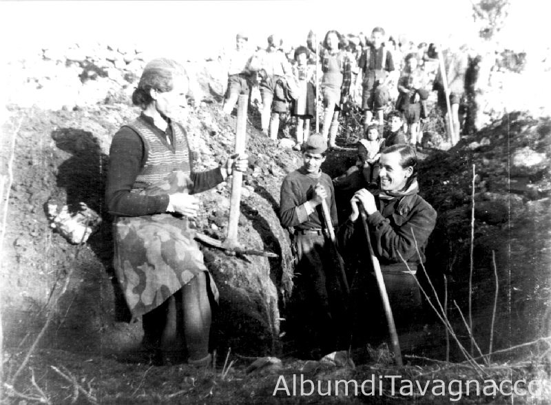 Una donna con il piccone, all'inizio di uno scavo di un rifugio di guerra, insieme a un uomo e ad un gruppo di bambini con le vanghe.