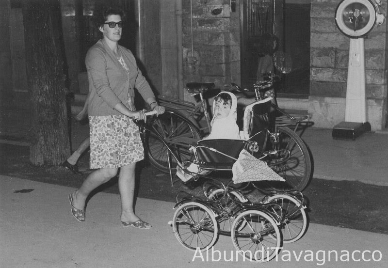 Donna che cammina sul marciapiede spingendo un passeggino con una bambina.