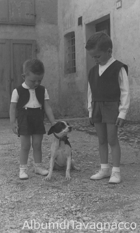 Due bambini (i fratelli Querini) con un cane, in un cortile.