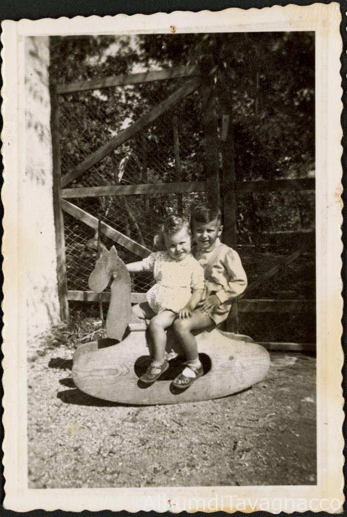 Ritratto di due bambini in posa sul cavallo a dondolo, davanti al cancello del cortile di casa Foschiatti.