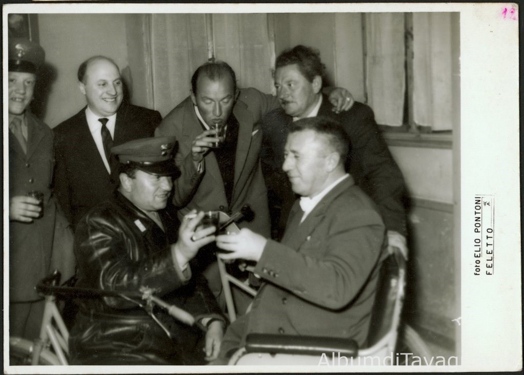 Gruppo di amici, tra cui due carabinieri e il pittore Innocenzo Coccolo (I¦ a destra), che brindano con del vino, all'interno di un bar.