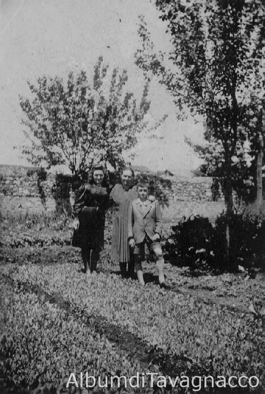 Due donne insieme a un bambino, in posa nell'orto.