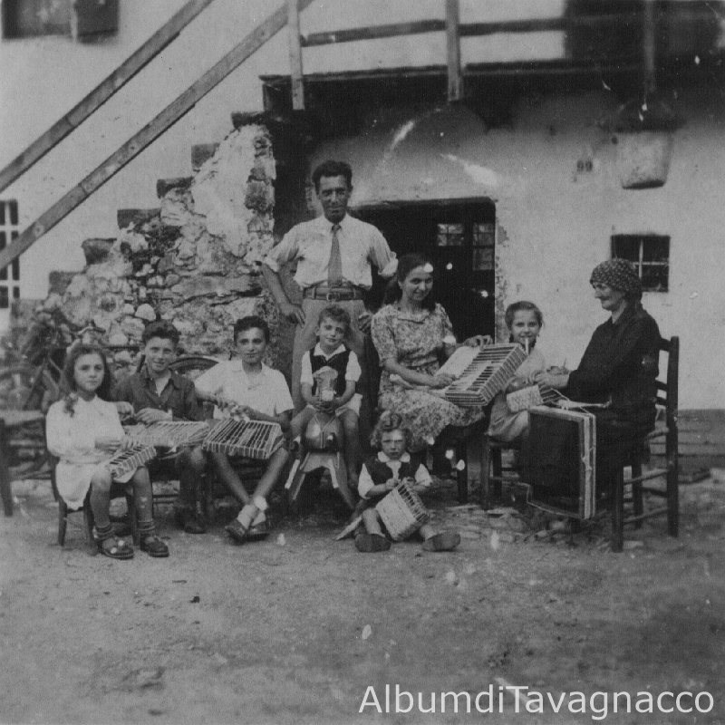 La famiglia di Pietro Petri in posa nel cortile mentre le donne e i bambini "e fasin lis sportis".