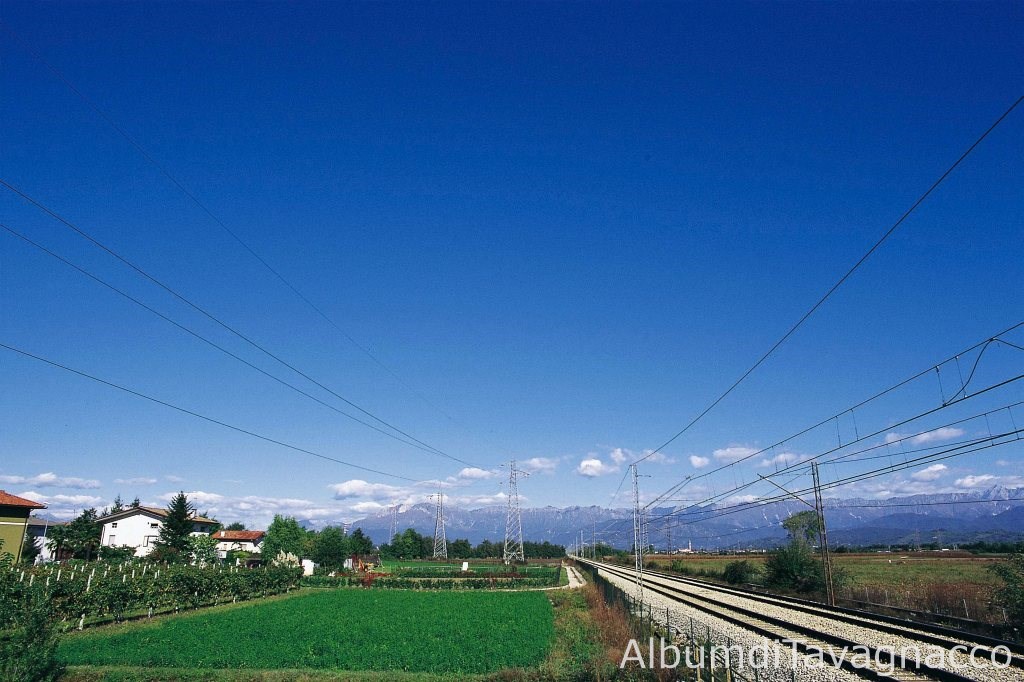 Ferrovia Udine-Tarvisio. - Tralicci. - Vigneto. - Case