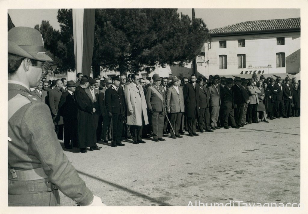 Piazza Libertà. - Sindaco Tavagnacco: Angeli Giannino. - Parroco: Don Nicolò Rossi. - Consigliere comunale: Bergagnini Giovanni. - Assessore comunale: Bulfone Pietro. - Consigliere comunale: Feruglio Aldo. - Consigliere comunale: Temporale Erminio. - Alpino: comandante