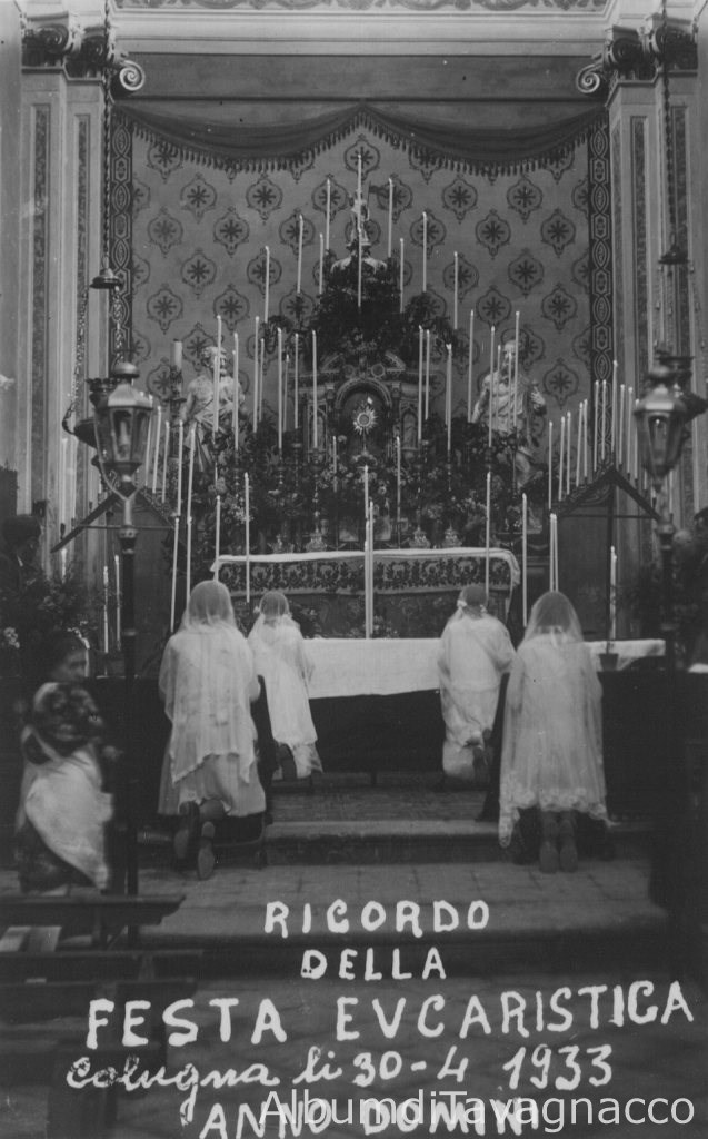 L'altare della chiesa dei SS.Pietro e Paolo con quattro bambine vestite da cerimonia religiosa, inginocchiate e riprese da dietro, in occasione della festa eucaristica.