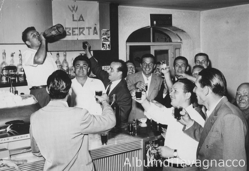 Gruppo di amici che brindano all'interno del bar "Al Cavallino", durante una festa per l'addio al celibato.