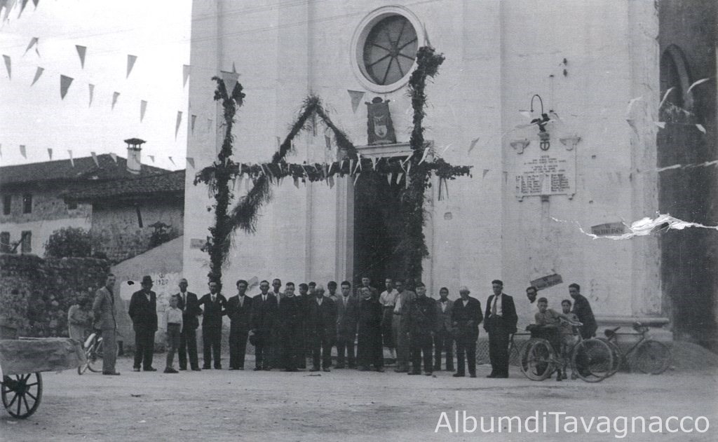 Gruppo di persone in posa sul sagrato della chiesa di S. Leonardo (Via Dante), in occasione di un evento religioso.