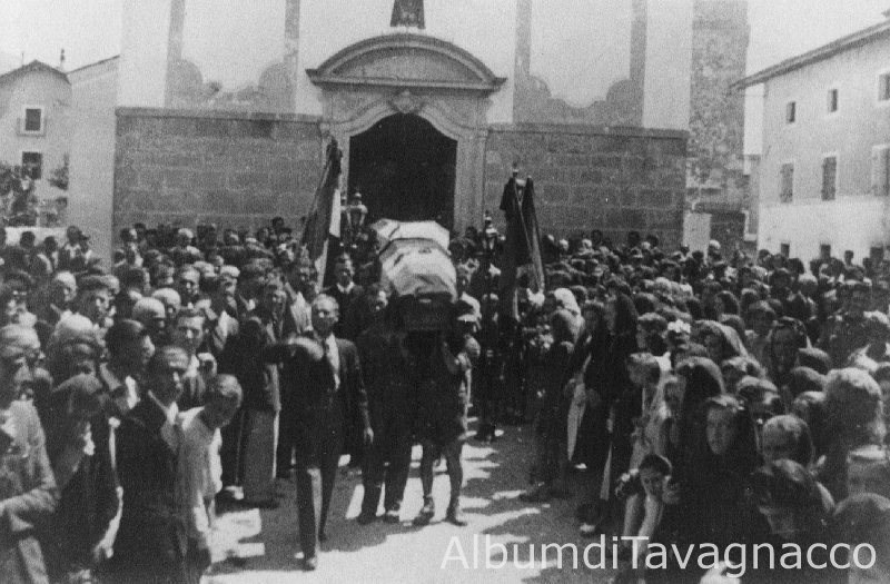 Folla all'uscita dei feretri dalla chiesa di S.Clemente, durante il funerale dei partigiani Sergio Catarossi, Giuseppe Foschiani e Ameris Petrizzo.