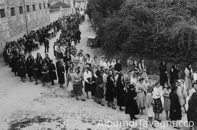 Corteo di persone in Via Della Chiesa, durante il funerale di Prè Simone, parroco di Adegliacco.