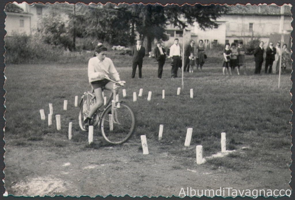 Una fase della gimcana ciclistica nel parco di Villa Tinin, durante la sagra di San Vincenzo (attività GIAC). In primo piano il passaggio di Idalgo Del Medico.