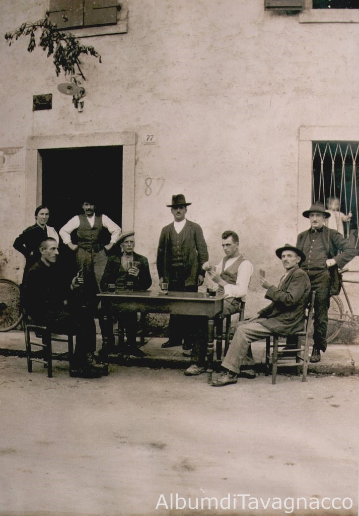 Gruppo di giocatori di carte seduti attorno a un tavolo all'esterno dell'osteria "Lý di Melie" (attuale "bar Julia"), in Via Molin Nuovo.