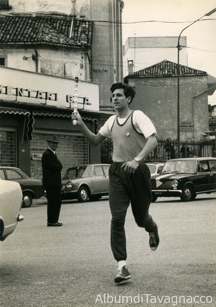 Giochi della Gioventù. L’arrivo del tedoforo Roberto Moffettone a Feletto U., in Piazza libertà, dove si è svolta la cerimonia di chiusura della fase comunale dei Giochi della Gioventù 1970.