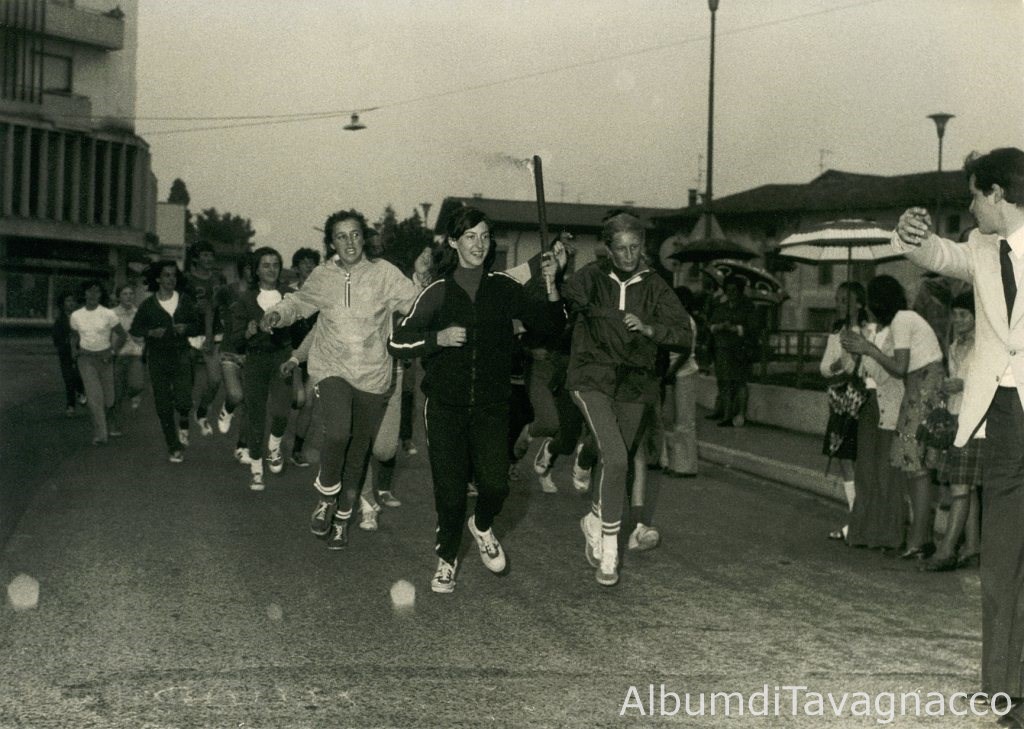 Giochi della Gioventù. La tedofora, insieme ad altre giovani atlete, mentre percorre con la fiaccola Via Mazzini.