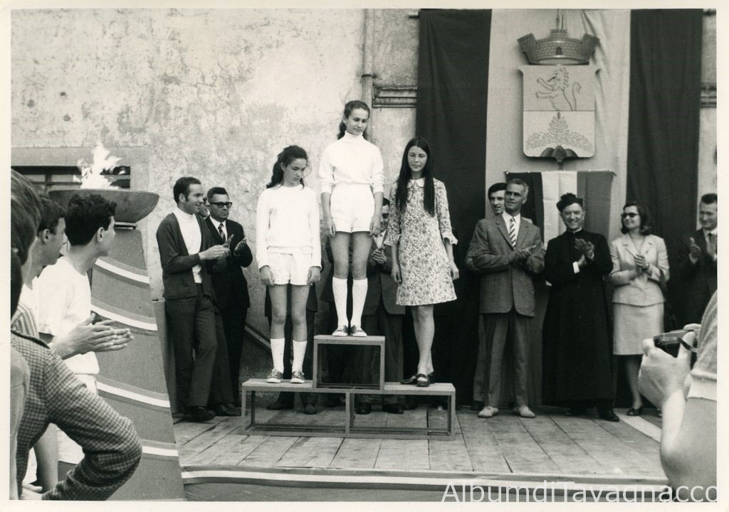 Giochi della Gioventù. La premiazione di alcune giovani atlete, alla presenza di varie autorità, davanti a Villa Tinin.