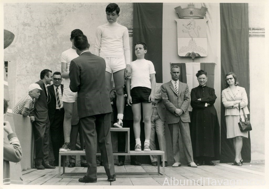 Giochi della Gioventù. Il sindaco Antonio Stella premia, alla presenza di altre autorità, alcuni giovani atleti, davanti a Villa Tinin.