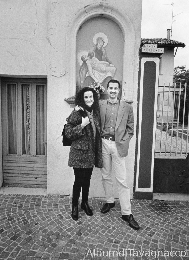 Giovane coppia in posa davanti al tabernacolo, in Via Cavour n° 43.