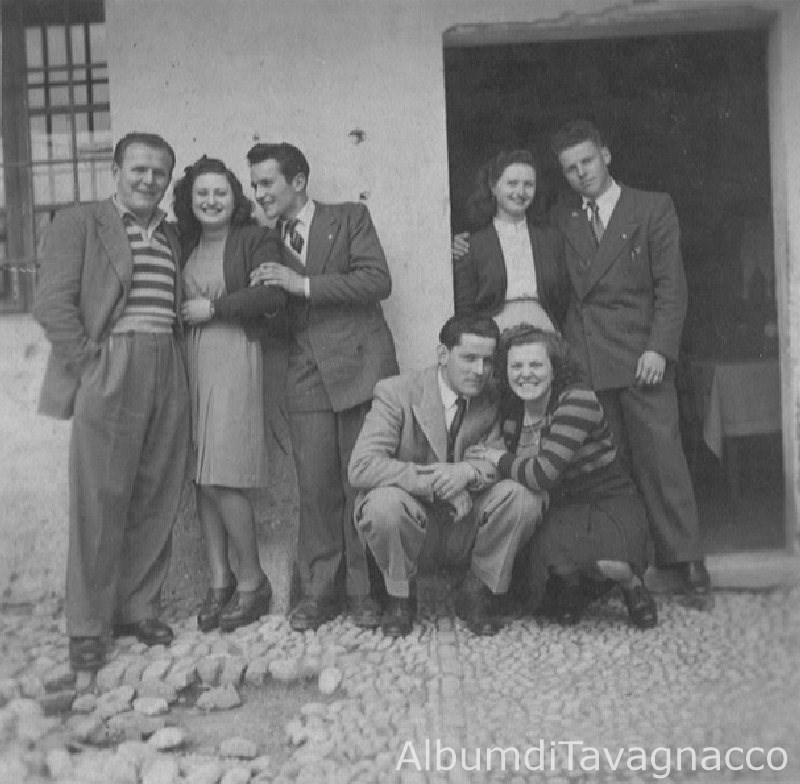 Gruppo di giovani del paese in posa insieme al "muini", all'interno di un cortile.