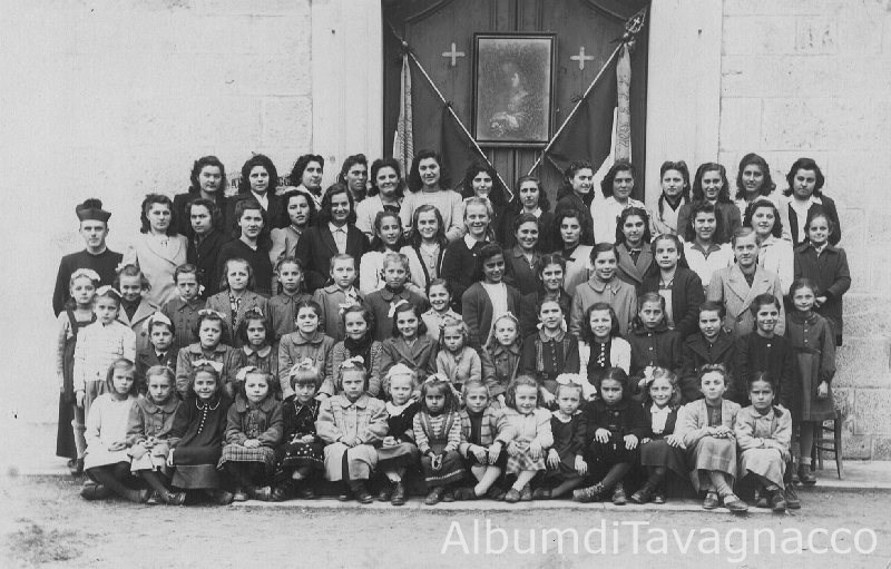 Gruppo femminile di giovani e bambine dell'Azione Cattolica, in posa sul sagrato della chiesa di S.Clemente.