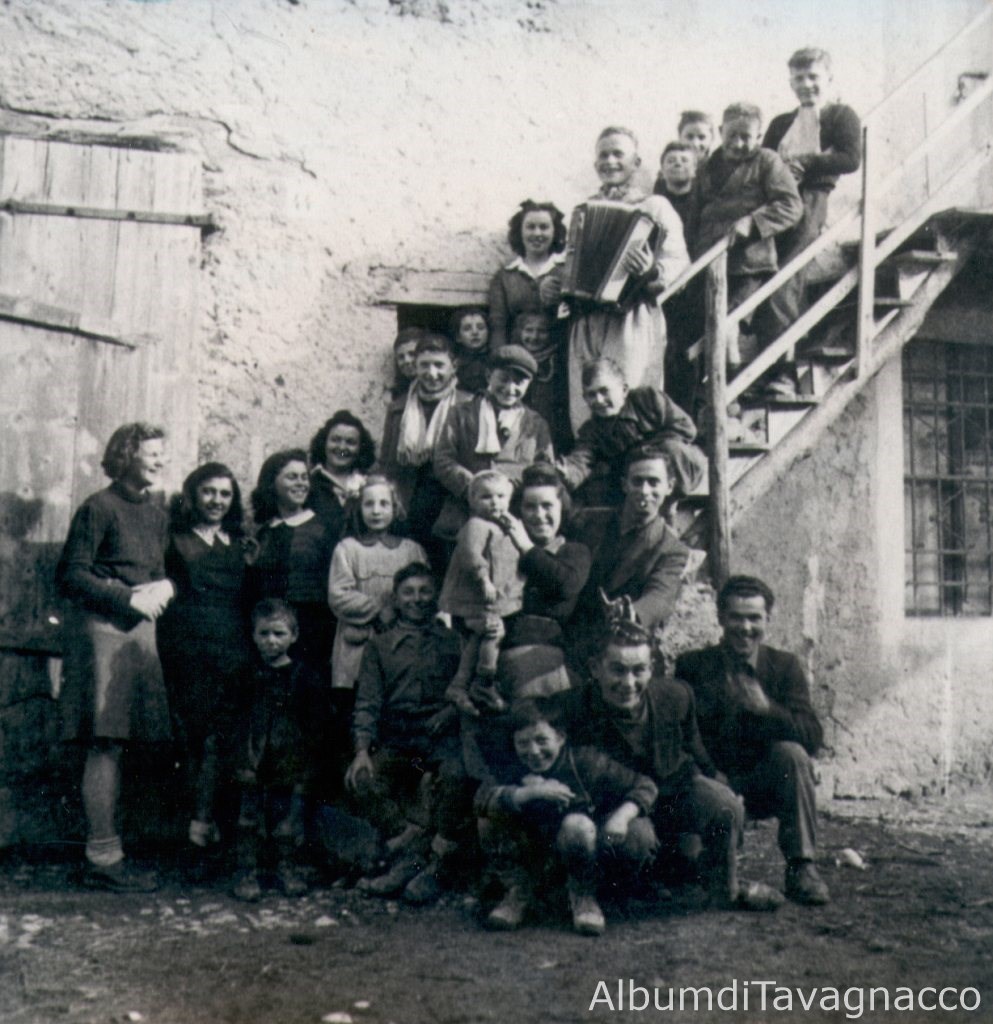 Gruppo di giovani e bambini del "Borc de Roe", in posa su una scala, all'esterno di una casa.