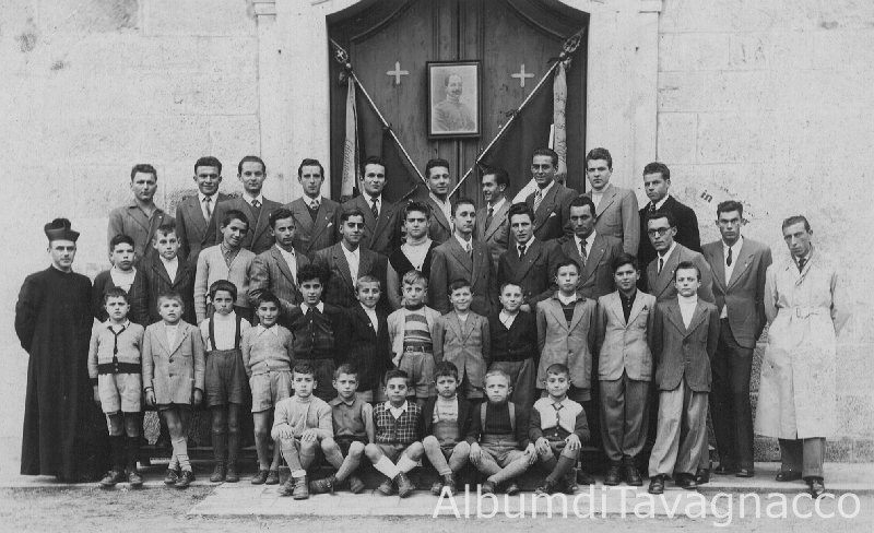 Gruppo maschile di giovani e di bambini dell'Azione Cattolica, in posa sul sagrato della chiesa di S.Clemente.