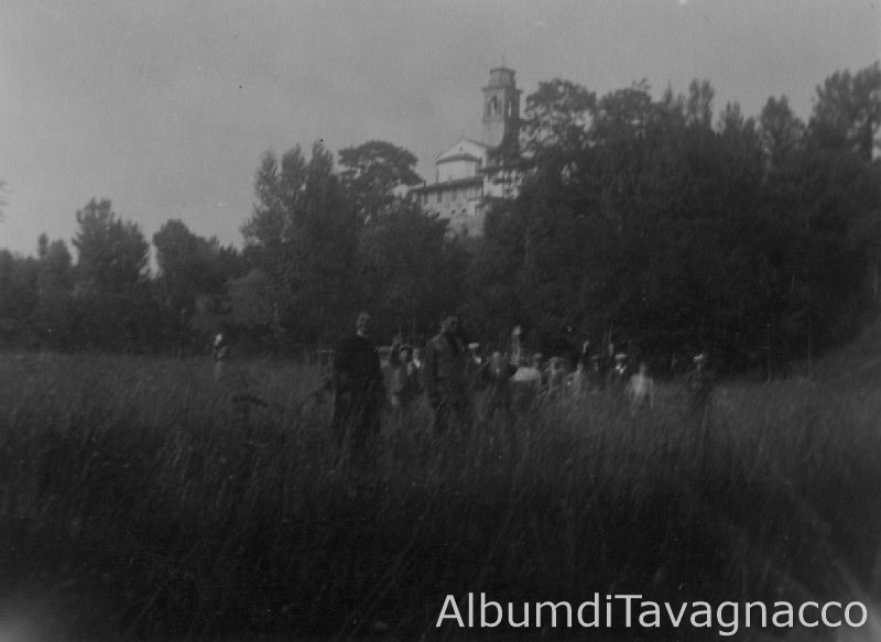 Gruppo di giovani in un prato del Cormor, in compagnia del parroco, Padre Paolino. Sullo sfondo la chiesa di S.Antonio Abate.