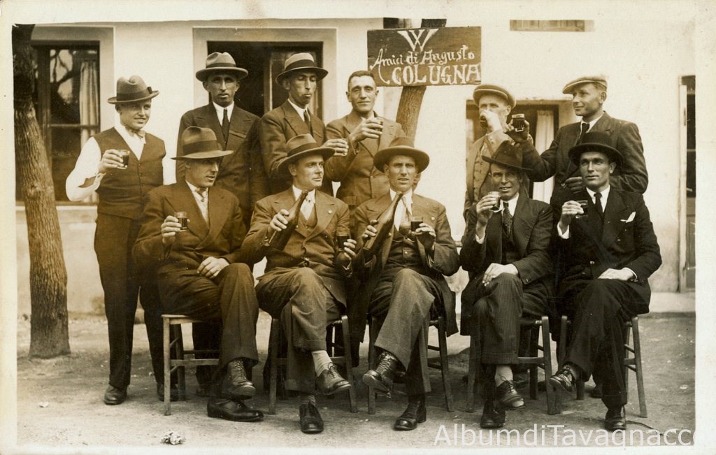 "Gli amici di Augusto", in posa davanti a una casa, mentre brindano con il vino.